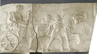 The affair of the forged bas-relief of the Tetricus emperors found in excavations at Nérac considerably damaged Du Mège's reputation. A marble bas-relief of the two emperors was discovered in 1832 in Nérac, department of Lot-et-Garonne in a Gallo-Roman villa in the area known as La Garenne, which was excavated under the direction of sculptor and forger Maximilien Théodore Chrétin.[9] Chrétin produced bas-reliefs and inscriptions attributed to Tetricus with the complicity of Du Mège.The authenticity of these pieces was quickly called into question and as early as 17 November 1834, the Académie des Inscriptions et Belles-Lettres proclaimed the inscriptions to be fake. Several of the inscriptions alluded to the existence of a certain "Néra", supposedly the wife of Tetricus I. In a note in the Acts of the SAM[a] (p. 209 of vol. 1), Du Mège claims to have discovered this Néra before Chrétin, thus proving his involvement with the forger. This deception almost destroyed the Société Archéologique du Midi which persisted in hiding the involvement of its secretary until recently, many of its dignitaries persisting in asserting in 1841, 1865, 1889 and even until 1940 that the famous quadriga preserved in the Musée Saint-Raymond is an authentic Roman piece, except for some inscriptions added by Chrétin. In a recent work, Hubert Delpont ripped these interpretations to shreds and demonstrated conclusively the involvement of Du Mège.[10]