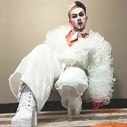 In April 2019, he was the victim of an LGBT-phobic attack on a public bus in the district of Miraflores.[5] That same month, thanks to his friendship with LGBTI+ singer and activist Eme, he traveled to Santiago, Chile to meet the drag king group Showking Colectivo. This trip introduced him to the ballroom culture and voguing.[3] In this scene, he is a Prince of the Kiki House of Brava and a member of the Ballroom Perú committee.[4]