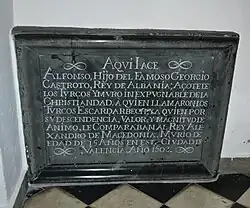 Alfonso Castriota was buried in the Royal Monastery of the Holy Trinity in Valencia, Spain, in 1503. His epitaph on the grave reads: "Here lies Alfonso, son of the famous Georgio Castroto, King of Albania, scourge of the Turks and impregnable wall of Christendom, whom the Turks called Escardarbech, and who was compared to King Alexander of Macedon due to his lineage, courage and magnitude of spirit. He died at the age of 15 in this city of Valencia, in the year 1503".[8][6]