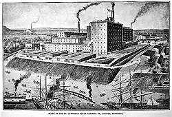 Baumgarten's training as a chemical engineer enabled him to develop the process of refining sugar beet.[1] The company imported raw sugar from the British West Indies and Europe before refining it into a pure substance. The plant was enlarged several times to accommodate the growth in demand. When the original buildings were destroyed by fire in 1887, a new factory was built at Maisonneuve on a riverside site that allowed the largest ships to unload their cargo near to the factory doors.[4]