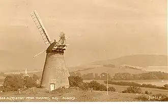 Alfriston Windmill was built in 1834. The mill was working until 1905 when a sail was damaged by a cow. The mill worked for another two years on two sails. In 1908, the mill was stripped of machinery, and had been converted into a house by 1910.[1]