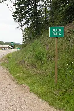 Alger Falls is a waterfall located along highway M-28 (Michigan highway) in Alger County, Michigan near Munising at the junction with M-94. The falls consist of a series of drops, the highest of which is about 15 feet (4.6 m). The falls can be seen from the highway. The level of water coming over the falls can vary greatly depending on snow melt or rainfall.