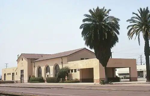The station building was reconstructed in 1940.[5][8]: 48 Passenger services were commuted to Amtrak in 1971, who took over operations at the depot. Trains ceased to stop in 1975 as the station was bypassed.[5][1][9] The tracks were depressed into a trench by the city with work starting in 1977.[2] The tracks currently run in the trench below surface grade throughout Alhambra, rejoining grade-level tracks in El Monte adjacent to Metrolink’s El Monte station, served by the San Bernardino Line. The station was subsequently destroyed by a fire in 1984.[8]: 48