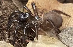Aliatypus is a genus of North American folding trapdoor spiders first described by C. P. Smith in 1908.[2] They resemble members of Ctenizidae in morphology and behavior, but this is due to convergent evolution rather than direct relation.[3] They are most closely related to members of Antrodiaetus, which build collar doors. It is likely that the shift from using collar doors to using trapdoors is what allowed them to survive in hot, dry conditions where their closest relatives could not.[4]