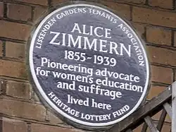 - ^ The blue plaque on her house, pictured here, describes her as a "pioneering advocate for women's education and suffrage": Retrieved 25 March 2011.