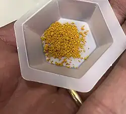 Alizarin Red S is used in histology and histopathology to stain, or locate calcium deposits in tissues.[1][3][4] In the presence of calcium, Alizarin Red S, binds to the calcium to form a Lake pigment that is orange to red in color.[4] Whole specimens can be stained with Alizarin Red S to show the distribution of bone, especially in developing embryos.[4] In living corals alizarin Red S has been used to mark daily growth layers.[5]