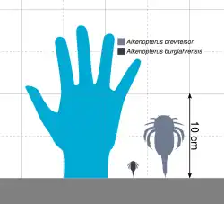 Like the other onychopterellids, Alkenopterus was a small eurypterid. The largest species was A. brevitelson, being 7.5 centimetres (3.0 inches) long.[1] The other species, A. burglahrensis, represents in fact the smallest species of eurypterid known as far, only measuring 2.03 cm (0.80 in).[2]