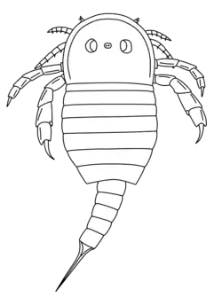 The opisthosoma (abdomen) suffered a strong to moderate first order differentiation, that is, it was divided into a preabdomen (body segments 1 to 7) and a postabdomen (segments 8 to 12). The preabdomen had lateral convex margins and was quite short and broad, with the first tergite (dorsal half of the segment) being less wide than the subsequent ones. The postabdomen was narrow, had a constant width and did not have epimera (lateral "extensions" of the segment), like the preabdomen. The segments of the whole body were hardly distinguishable from each other. The integument of the body lacked ornamentation[2] and was very smooth.[3] The main difference between A. brevitelson and A. burglahrensis was the length of the telson (the posteriormost division of the body).[2] The one of A. brevitelson was short, measuring only 0.55 cm (0.22 in) in a 7.5 cm (3.0 in) long specimen. The ratio between the total body length and telson of this specimen is around 13.6. It was slightly subtriangular (almost triangular) and had a median "keel" (ridge), with an expanded anterior base articulated to the pretelson (segment that preceded the telson).[1] In the other hand, the telson of A. burglahrensis was long, measuring 0.35 cm (0.14 in) in a specimen with 2.03 cm (0.80 in) in total, with a ratio significantly small of 5.8. It had an expanded anterior portion as well. The telson of both species had, however, the same styliform shape.[2]