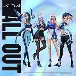 All Out (stylized in all caps) is the only extended play by virtual girl group K/DA. The EP was released on November 6, 2020, through Riot Games and Stone Music Entertainment.[1] The EP contains five songs which feature vocals from the original line-up (G)I-dle, Madison Beer, and Jaira Burns plus a variety of influential singers, such as Bea Miller, Wolftyla, Lexie Liu, Kim Petras, Aluna, Bekuh Boom, and Annika Wells and with Twice members Jihyo, Sana, Nayeon, and Chaeyoung. Each song was produced by one of the fictional members of the group, with the exception of "More".