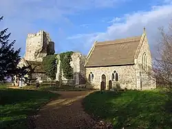 The church dates from the 15th century. The roof of the nave collapsed in a storm on 15 July 1762; the nave and tower, of Perpendicular style, is in ruins. The nave is of knapped flint, and has large windows with remains of tracery.[2][3]