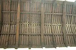From the 14th century come several glass windows, including a coronation of Mary. From 14th and 15th century, respectively, originate the two entrance buildings in the south and north of the church as well as the doorways in them. The doorway in the southern entrance are decorated with coats of arms, lions and other symbols associated with the patron saints of the church. Also from the 15th century is the baptismal font still in use today. The most important work of art left in the church by the 15th century is the wooden ceiling. Below the gable is a series of excellently carved angels with outstretched wings. The edge of the ceiling is decorated by a variety of figures such as kings, queens, musicians and devils.