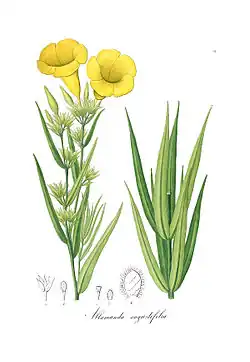 Allamanda angustifolia is a species of plant in the genus Allamanda in the family Apocynaceae, which is found in Brazil, typically in Cerrado vegetation. This plant is cited in Flora Brasiliensis by Carl Friedrich Philipp von Martius. Known in English as alamander, it has been widely cultivated and naturalized in Florida and elsewhere in the United States.
