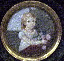 Mary Shelley had called the baby Allegra "the little Commodore" because of her sturdy body and alert, intelligent look. Byron was also pleased with Allegra's resemblances to himself in appearance and temperament. When she was eighteen months old, he wrote in a letter to a friend: "My bastard came three days ago—very like—healthy—noisy & capricious."[10] In an 1818 letter to his half-sister Augusta Leigh, Byron wrote that "She is very pretty — remarkably intelligent ... She has very blue eyes — that singular forehead — fair curly hair — and a devil of a spirit. but that is Papa's."[11]