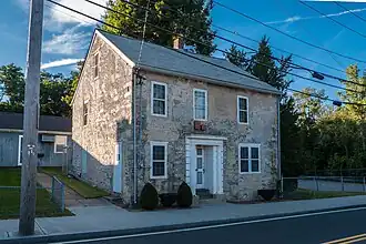 The Allenville Mill Storehouse is a 30-foot (9.1 m) two story square stone rubble-construction storehouse erected by Phillip Allen. The exact date of construction is unknown, but it was built with rubble-construction as was typical of mill construction during and after the War of 1812. In 1813, Allen purchased 4.5 acres from Esek Smith to construct a mill on the empty land. The exact date the mill and the storehouse was built is unknown, but Allen's brother, Zachariah, noted in his diary a payment from "P. Allen for building his factory" on March 5, 1821. The first record of the building is from an 1836 insurance policy obtained by Philip Allen for the cotton factory and a "Store and cloth room". Further evidence it was used as the storehouse comes from a lithographic map from 1858 and in the town's deeds. Allen sold the property in 1857 and it changed owners again in 1860, and was renamed to the Smithfield Manufacturing Company.[2] Ownership changed in 1879, and it was renamed Enfield Mills and transferred again in 1906 and renamed Esmond Mills.[3] In 1937, the building was used as a post office and described erroneously as the "Old Allenville Mill".[2][4] The discovery that it was a storehouse and not the mill was made only during the National Register of Historic Places survey.[3]