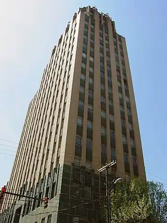 Construction of the building began in 1929 and was completed in 1931, and it was designed by Stanhope S. Johnson and Addison Staples. The 17-story, 40-foot (12 m) by 132-foot (40 m) building was the tallest building in Lynchburg until completion of the Bank of the James Building in 1972. It is steel framed and faced in yellow brick and greenstone in Art Deco style.[4] Its outer shape and design is very similar to that of the Central National Bank in Richmond, Virginia.