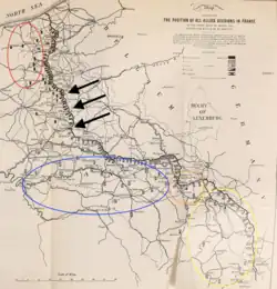 After lunch at French headquarters on March 25, French Minister of Munitions Louis Loucher estimated the chances of an Allied defeat at 90%; General Petain corrected him and said it was 96%.[26][27] Pétain then told Loucheur that Prime Minister Clemenceau should be urged to ask for peace.[28] Under orders from Paris, in the afternoon on an easel in his office, General Pétain was arranging the redeployment of his armies to protect the capital. The situation bottomed out as Pétain envisioned the separation of the French and British armies, with the British falling back to Calais to defend its supply routes near the English Channel, and the French having to extend its army to the ocean somewhere behind the British lines. This would result in a series of battles north of Paris, and a French loss would mean Paris would be abandoned, with very serious consequences for the country.[29] To prevent this, it was necessary to defend the capital immediately, and orders for this were issued.[30]