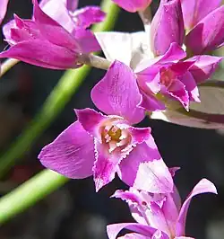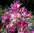 Allium crispum grows from a bulb one to one and a half centimeters wide and sends up naked green stems topped with inflorescences of many flowers, each on a short pedicel. The flowers are magenta in color and have six triangular tepals. The inner three tepals are smaller and crinkled like cloth and may curl under. Anthers and pollen are yellow.[3][5][6] The leaves are narrow and linear, typically slightly shorter than the stems and about 1.5 millimeters wide.[7]