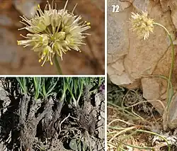 Allium tianschanicum has a cluster of bulbs each up to 20 cm in diameter. Scape is up to 25 cm long, round in cross-section. Leaves are channeled, up to 15 mm across, shorter than the scape. Umbel is densely packed with many yellow or white flowers.[2][3]