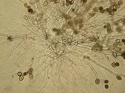 | Zoosporangia of an Allomyces sp. sporophyte growing on agar. | |