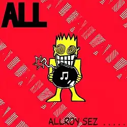 Allroy Sez is the debut album by the American punk rock band All, released in March 1988 through Cruz Records. Following the departure of singer Milo Aukerman from the Descendents, the remaining members—bassist Karl Alvarez, guitarist Stephen Egerton, and drummer Bill Stevenson—recruited singer Dave Smalley and changed the name of the band to All, which was both the title of the Descendents' 1987 album and a philosophical concept invented by Stevenson and friend Pat McCuistion in 1980. Allroy Sez introduced the character of Allroy, who would serve as a mascot for the band and be featured on many of their subsequent album covers.