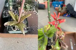 Flowers like many other aloes. Orange tubular, with a white tip on the petals. Flowers on a long stalk. Single flower on each stalk.[1]
