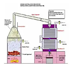 Oud oil can be distilled from agar wood using steam; the total yield of oil for 70 kg of wood will not exceed 20 ml.[37][38]