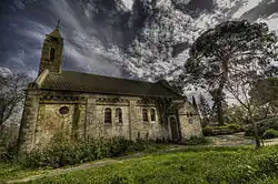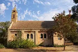 Hans Martin Kuno Moderow (1877-1945), pastor of the Haifa Evangelical Congregation (1908–18),[50] also provided services in Waldheim, at the beginning in the living room of the new house of Waldheim's then mayor Gottlob Weinmann. The Waldheimers saved funds for a church of their own and could thus lay the cornerstone for the church in early 1914. The Haifa-based architect Otto Lutz led the construction works. In 1921, the Evangelical church at Alonei Abba, which still stands today, was inaugurated.[51] The Alon winery, surrounded by a grove of oak trees, is located in the former dairy cooperative (est. 1913).[52]