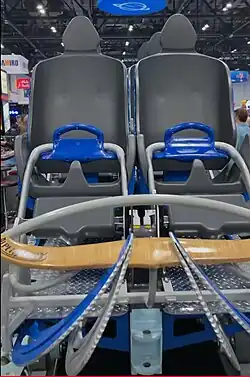 The ride vehicle for AlpenFury, manufactured by Premier Rides, was showcased at the IAAPA Expo[13] in Orlando, Florida.[14] It has a three-row, two-abreast seating arrangement with high-backed seats and blue hand grips attached to a lap bar restraint system. The seats are grey with a contoured design. The ride operates with two trains, each composed of three cars, with each car featuring three rows of two, allowing for a total capacity of 18 riders per train.[10]