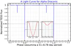 The secondary star was detected in high spatial resolution observations using the Navy Precision Optical Interferometer. The secondary star is 1.8 magnitudes (at 700 nm) fainter than the primary star and was detected at separations ranging from 6.2 to 2.6 milliarcseconds.[16] Eclipses were detected using data obtained with the Transiting Exoplanet Survey Satellite (TESS).[17] The presence of eclipses places Thuban into the class of binaries known as eclipsing binaries.[3]