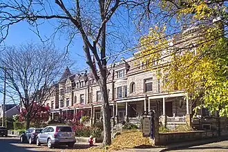 The Alpha Terrace Historic District is a historic district in the East Liberty neighborhood of Pittsburgh, Pennsylvania, United States. The site consists of twenty-five stone rowhouses, which were built between 1889 and 1894 using a heterogeneous mix of Queen Anne and Romanesque Revival architectural influences. Until they were subdivided and individually sold in the 1950s, the properties were part of a single block of upper-middle-class rental units; for a time, U.S. Steel leased a number of the homes for use by corporate executives. [1]