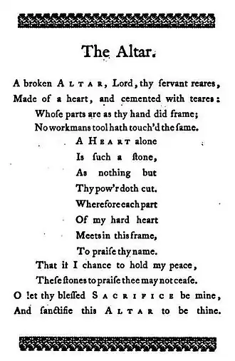 A nearly contemporary poem by William Bosworth (written about 1628, although not printed until 1651) matches the form of Herbert's altar exactly. It appears untitled near the end of the "Haemon and Antigone" episode in his The Chaste and Lost Lovers, beginning with the lines "Those that Idalia's wanton garments wear/ No Sacrifices for me must prepare". There too is a repetition of the word 'altar' in connection with the word 'sacrifice' which, more logically than in Herbert, appears on top of the altar.[11] Edward Benlowes' poem "The Consecration", in his Theophila, or Loves sacrifice: A divine poem (1652), was dissimilar in form from Herbert, but was surrounded by a drawn outline to make the likeness to an altar clearer,[12] as happened in some later editions of Herbert's poem.[13] In the last quarter of the century appeared Samuel Speed's verbally "servile imitation" of Herbert,[14] also titled "The Altar", in his Prison Pietie (1677).[15]