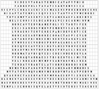 Finally there is a poem written in Latin by Publilius Optatianus Porfyrius dating from the first quarter of the 4th century. In this the altar describes its construction as "polished by the craft of the poet's musical art (fabre polita vatis arte musica)…I am straightly confined and hold back my edges as they attempt to grow and then, in the succeeding portion, let them spread more broadly." It then elaborates in an equally self-descriptive way.[3] The poem has been judged to be 'undoubtedly a direct imitation of "Jason's Altar"' by Dosidas.[4]