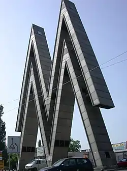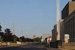 - [8][20] From 1927 commonly named Achilleion;[21] since 1950 under the name "Soviet Pavilion". The exhibition hall was extended in the mid-1920s for a Palace of Sports during the winter months. From 1950, its portico, topped by the Soviet star (at a height of 64 m, or 210 ft), exactly in the vista of the axis of 18 October and often appearing on stamps and pictures, was commonly used as an image of the fair.[14] The building was used by the Soviet Union for its trade exhibitions. In 1977, the Soviet Union permitted the redesign of the facade.[22] In 1996, Leipzig purchased the Soviet Pavilion for 20 million Deutsche Mark from the Chamber of Commerce in Moscow.[23] In 2003, the white tiles had to be taken off for security reasons. The portico is listed, like three other objects at the Alte Messe. The hall behind the portico was in urgent need of rehabilitation. The head building[24] and the portico of the hall were renovated until 2018,[25] the parts behind were going to be rebuilt new.[23] The first stone laying was on 28 November 2016, the inauguration on 29 October 2019.[18][26] The preservation of the head building and the portico is secured.