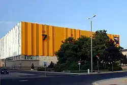 The first Trade Fair after the war was held in four halls in 1946.[13] In the following years, several extensions, rebuildings and new constructions were carried out, among them in 1950 the conversion of the former Achilleion into the Soviet Pavilion,[14] exhibition hall 7 (1977),[1] exhibition hall 22 (1989–1992) and an administration building at the north gate.[15] There also arose a lot of smaller buildings and temporary arrangements. From 1991 until 1996 some specialised fairs were undertaken, before the newly built exhibition halls in the north of Leipzig went into service in 1996.[16][17]
