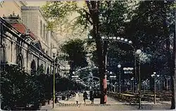 The first municipal Tonhalle was built in two years and opened in 1865. It was located on Flinger Steinweg, today's Schadowstraße.[4] The building had a large concert hall, the Kaisersaal, which was 42.48 m long and 24.20 m wide. With two galleries, this room held 2820 people. The hall, which was distinguished by good acoustics, was named after Kaiser Wilhelm I, in whose honour the Rhenish Provincial Estates was given a banquet in the Tonhalle on the occasion of his visit on 18 September 1884.