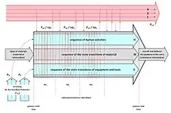 - A sequence of mutually dependent states of material transitions that occur due to purposeful actions (or designed and run by personnel) and influenced by functioning equipment. As a result, input material is transformed into a desired output or product.