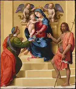 Vasari frescoed the Triumph of Ceres in the main hall of the Villa Altoviti now shown in the National Museum of Palazzo Venezia.[11] For Bindo's suburban villa he also frescoed a vast loggia called the Vineyard decorated with statues and burial marbles from emperor Hadrian's Villa Adriana as he had bought most of the estate.[12] Andrea Sansovino also gave Bindo as a gift a terra-cotta model of the statue of St. Giovanni he sculptured for the Duomo in Florence.