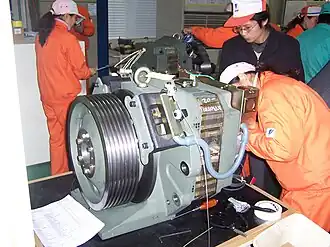 A Warner Electric elevator brake installed on a Japanese traction motor.