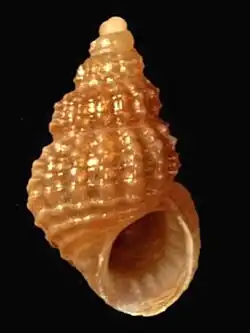 The shell is yellowish, orange brown or yellowish white. It is longitudinally distantly costate, spirally lirate, and forming nodules on the ribs. The base of the shell is without ribs, but spirally striate. The shell contains 5-6, very convex whorls. The suture is deep and channeled. The outer lip is externally thickened.[2]