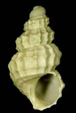 The teleoconch has 3.3-4.2 convex wholes with "strong, widely spaced, nearly vertical axial folds." [2] The body whorl is rounded with eight spiral and axial folds that fade "towards the periumbilical area". [2]