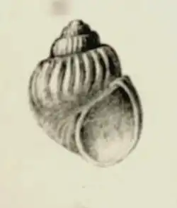 The small, white shell is inflated, very thin, fragile, undergrounded. The shell contains 3 to 5 whorls, of which the two apical ones are pearly, white. The others are graduated, ventricose and smooth. They are much impressed at the sutures. The shell is longitudinally obliquely ribbed. The ribs are indistinct and superficial. They disappear completely at the base and are spirally striated everywhere. The aperture is round and continuous, with a thin peristoma. The columella is slightly excavated.