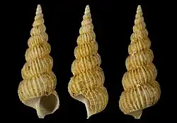 (Original description in Latin) An elongated, turreted, imperforate shell, marked by transverse striations and densely packed with fine longitudinal ribs. The whorls are tightly contiguous.