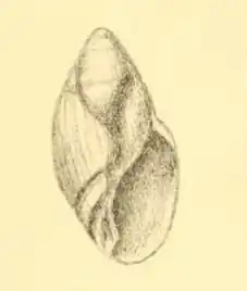 (Original description in Latin) The shell is oblong-ovate, thick, and pale purplish, with dark bands on the anterior and posterior ends. The spire is moderately elevated and slightly blunt, consisting of six flatly convex whorls, covered by a thin callus. The polished callus is adorned with brown and tawny bands. The body whorl is gently convex and smoothly rounded. The columella is arched and thickened, with a purple hue, bordered at the top by a broad brown callus. The aperture is oblong-oval, with a deep purple interior.[2]
