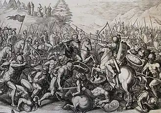 Early Church fathers such as Justin Martyr, Irenaeus and Cyprian consider the defeat of Amalek in Exodus 17:8–13 to be reminiscent of Jesus defeating the powers of the devil at the cross. Origen sees the battle as an allegory of the Law mysteriously invoking Christ, who recruits strong people (i.e. Christians) to defeat the demonic Strong Man, as described in Ephesians 6:12.[98]