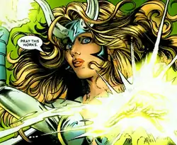 Jimaine and her mother Margali are Manouche witches. When Nightcrawler joined the X-Men, Jimaine eventually followed him to the US, assumed the identity of Amanda Sefton, took a job as a flight attendant, and became Nightcrawler's girlfriend.[3][4] When Margali attacked the X-Men, believing Nightcrawler to have been responsible for the death of Stefan Szardos (her son; Jimaine's brother), "Amanda" revealed herself as Jimaine, convinced her mother to let Kurt live, and resumed her on-and-off relationship with him.[5] Their relationship broke apart when Kurt suffered a severe case of self-doubt following an encounter with the Beyonder upon the latter's arrival on Earth.[6]
