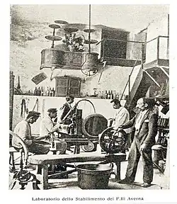 The third generation, Francesco's sons Salvatore, Paolo, Emilio and Michele consolidated the firm's success and contributed to its evolution, despite all the difficulties arising from two world wars, to such an extent that the company was able to continue production without interruption, even succeeding in starting an export business to America. In 1958 the Averna Company became a public corporation (Fratelli Averna S.p.A.). Some years later a new factory was built.[2]