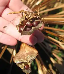 Stamens clustered, arising from the perianth tube, ± declinate or erect, shortly connate at base. Stigma capitate, trilobate (three-lobed). Each locule has 3-10 superimposed ovules whose shape resembles a spinning top. Style filiform, declinate. The water-rich, non-dormant, ovoid, reddish green seeds are borne in large, dry capsules that are spindle-shaped or three-angled, obtuse or acute, transversally veined, and often heavily ribbed. Capsules are dehiscent loculicidally or breaking unevenly. Dehiscence in most species of Brunsvigia is somewhat tardy and confined to the apex of the capsule, hampered below by heavy ribs that keep the septa closed for most of their length.[4]