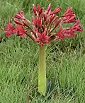 Brunsvigia is the only genus of Amaryllideae in which several species have stout, somewhat tubular, brilliant scarlet, pink, or red flowers that are adapted to bird pollination.[6]