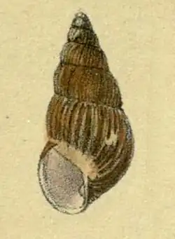 The shell is acuminately turrited, sinistral, and imperforate. It consists of 7 whorls that are flatly convex, coarsely and irregularly striated longitudinally, without any marginations. The sutures are somewhat rough but well-impressed. The aperture is ovate, approximately two-fifths the length of the shell. The columellar fold is slight, oblique, and tortuous. The shell is covered with an earthy brown epidermis, with the apex being darker in color. The aperture and columella are white and shining.