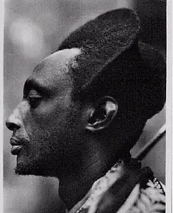 Amasunzu is an elaborate hairstyle traditionally worn by Rwandan men[1] and unmarried women,[2] with the hair styled into crests,[1] frequently described as crescent-shaped.[3] The hairstyle indicated social status, and men who did not wear Amasunzu were looked on with suspicion until the 20th century.[1] The style was also worn by unmarried women after the age of 18–20 years, indicating that they are of marriageable age.[3][2]